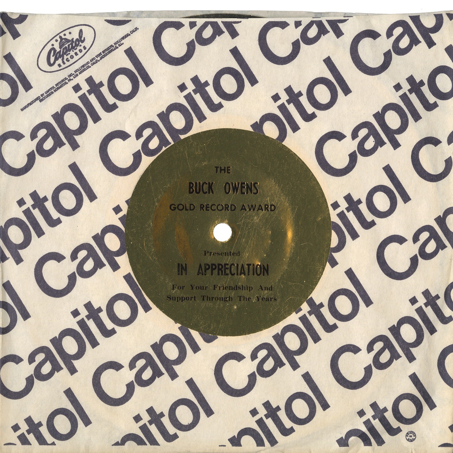Available while supplies last, Bakersfield Bonanza Bundle, a special bundle of 98 vintage 45s. Direct from the vaults at the Crystal Palace, this collection of vintage 45s comes from Buck Owens’ original stock and includes a certificate of authenticity, a Buck Owens promo letter, and a special Gold Record Award.